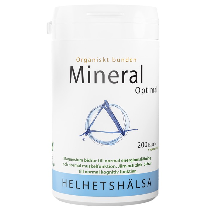 Helhetshälsa MineralOptimal innehåller magnesium som bidrar till normal energiomsättning och till att minska trötthet och utmattning. Magnesium bidrar också till normal muskelfunktion och till nervsystemets normala funktion.