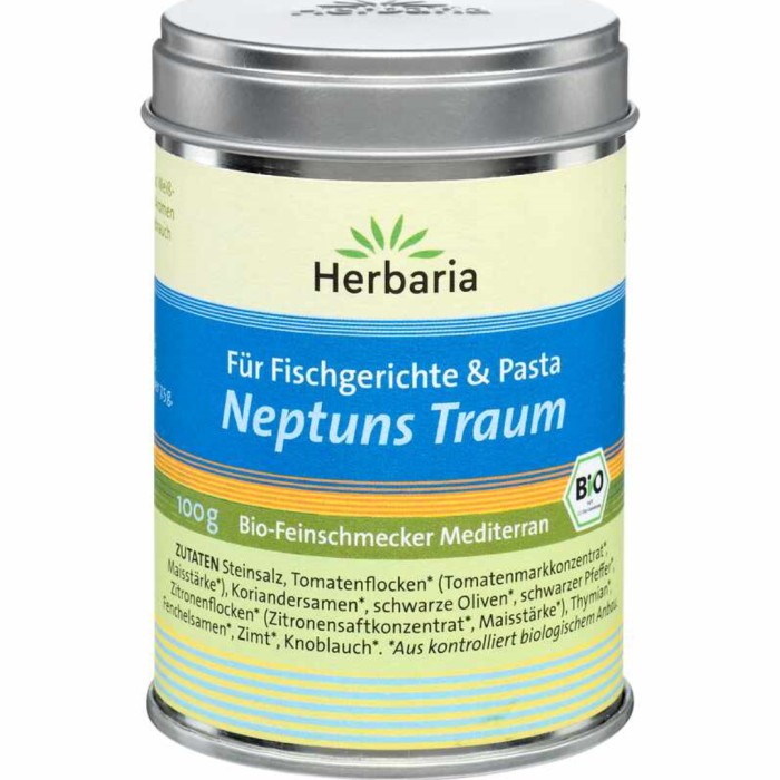 Herbaria Neptuns dröm är ett kryddsalt med oliver som kan användas till en kall sås, och till att smaksätta fisk- och kycklingrätter. En god krydda att använda till laxpaket i folie.