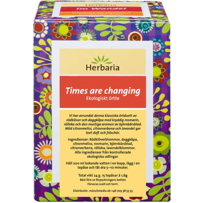 Herbaria Times are Changing är ett örtte är ett Wellbeing-te med av rödklöver och daggkåpa samt kryddig rosmarin, rölleka och med den mustiga aromen av björnbärsblad. Mild citronmeliss, citronverbena och lavendel ger teet doft och fräschör. Alla ingredienser från kontrollerade ekologiska odlingar.