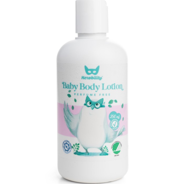 Herobility Baby Body Lotion är en oparfymerad hudlotion framtagen för att skonsamt vårda och skydda babyns känsliga hud. Den oparfymerade lotionen innehåller milda ingredienser och bevarar hudens naturliga fuktighet. Passar för daglig användning.