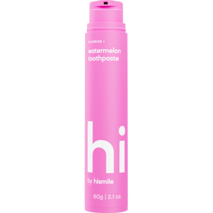 Hi by Hismile är en serie tandkrämer framtagna för att göra tandborsteningen lite roligare. Tandkrämerna från Hismile har spännande smaker som Watermelon, Peach Iced Tea och Mango Sorbet. Alla smakerna har en mint-touch för att ge en fräsch känsla. Denna tandkräm har en smak av vattenmelon. Innehåller fluor.