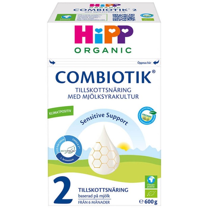 HiPP Combiotik 2, ekologisk tillskottsnäring från 6 månader är utvecklad med bröstmjölken som förebild. Innehåller kostfibern GOS (Galaktooligosackarider) från laktos och aktiv mjölksyrakultur (Limosilactobacillus Fermentum). Berikad med fettsyrorna omega-3 (DHA) samt omega-6 som bidrar till normal synutveckling för barn upp till 12 månader, normal hjärnutvekling och normal tillväxt och utveckling av barn. Järn bidrar till normal kognitiv utveckling hos barn samt till immunsystemets normala funktion. Kalcium och vitamin D för normal tillväxt och utveckling av ben hos barn. HiPP Combiotik 2 innehåller även Metafolin®, den naturliga formen av folsyra som finns i bröstmjölk.