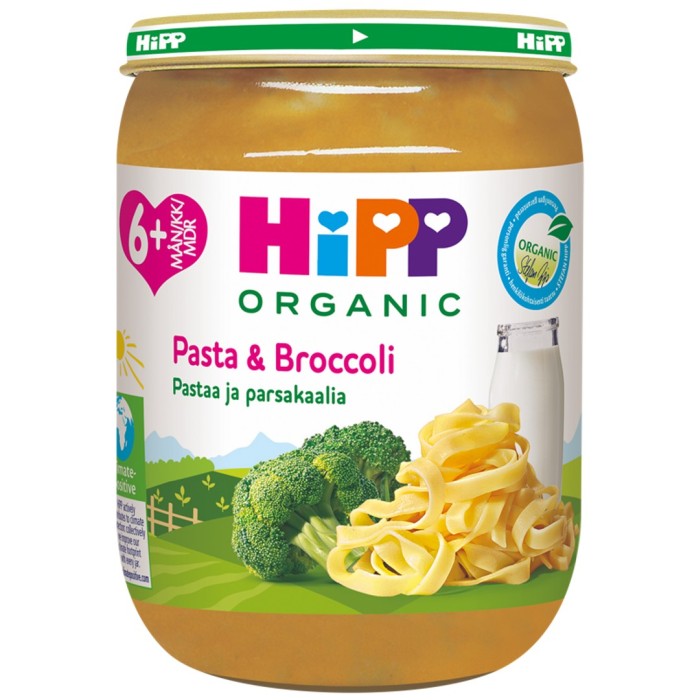 HiPPs Pasta med broccoli är en måltid för barn från 6 månader, en välsmakande varmrätt gjord på utvalda ekologiska råvaror.