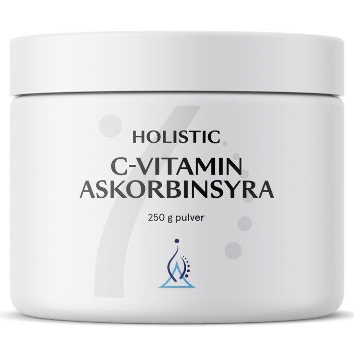 Holistic C-vitamin är ett kosttillskott i pulverform som innehåller ren askorbinsyra. Vitamin C bidrar till immunsystemets normala funktion och till att skydda cellerna mot oxidativ stress. Vitamin C bidrar även till normal kollagenbildning som har betydelse för hudens, tandköttets, benstommens och broskets normala funktion.