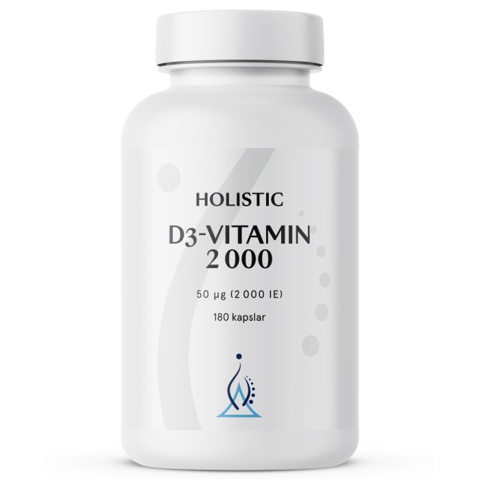 Holistic D3-vitamin 2000 IE är ett kosttillskott som innehåller 50 µg vitamin D per kapsel. D-vitamin är ett fettlösligt vitamin som bidrar till immunsystemets normala funktion, normal muskelfunktion och till att bibehålla normal benstomme och normala tänder.