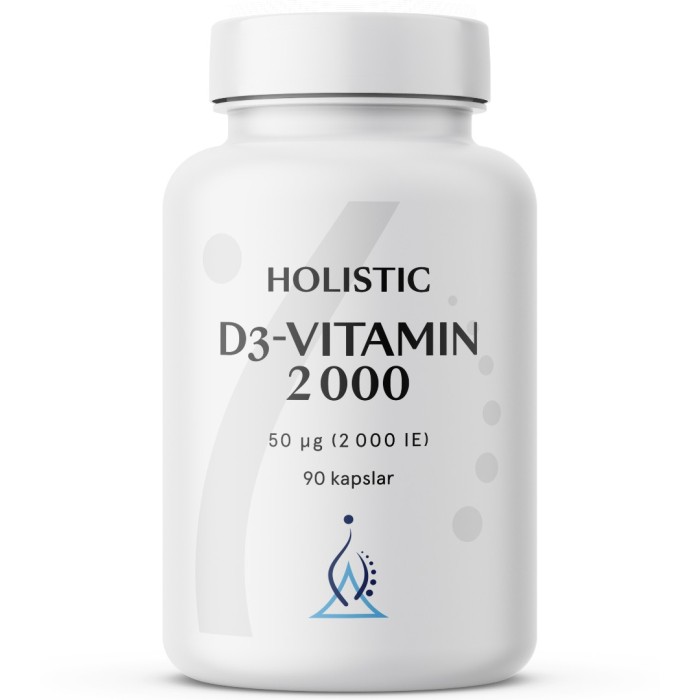 Holistic D3-vitamin 2000 IE är ett kosttillskott som innehåller 50 µg D-vitamin per kapsel. Vitamin D är ett fettlösligt vitamin som bidrar till immunsystemets normala funktion, normal muskelfunktion och till att bibehålla normal benstomme och normala tänder.