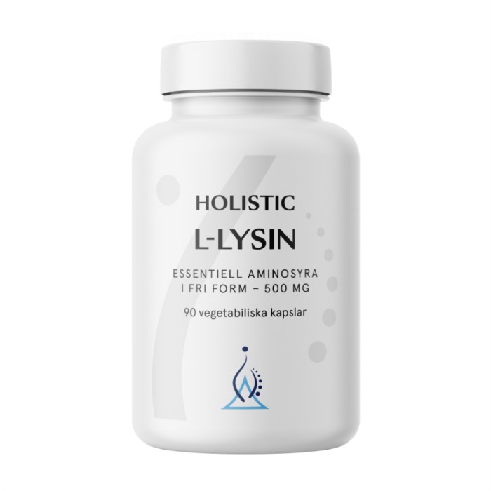 Holistic L-Lysin är ett kosttillskott som innehåller 500 mg lysin i fri form. Det innebär att den inte är bunden till andra aminosyror eller är en del av ett protein, vilket underlättar upptaget i kroppen. Lysin ingår i en mängd olika biologiska processer och behövs bl a för att bilda proteiner, vilket är viktigt för att bygga och reparera muskler och vävnader. I kroppen finns lysin i elastin och kollagen, som är komponenter i hud, blodkärl och ligament. Lysin är en essentiell aminosyra, vilket innebär att kroppen inte kan producera den själv. Finns i kosten i exempelvis fisk, kött och baljväxter. Vegansk.