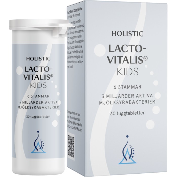 Holistic Lactovitalis Kids är tuggtabletter som innehåller 3 miljarder mjölksyrabakterier från 6 stammar. Kosttillskottet innehåller dessutom vitamin C som bidrar till immunsystemets och nervsystemets normala funktion, samt till normal psykologisk funktion. Tuggtabletterna har en patenterad teknik som skyddar de känsliga mjölksyrabakterierna på vägen till tarmen. Bakteriekulturerna är helt mjölkfria.