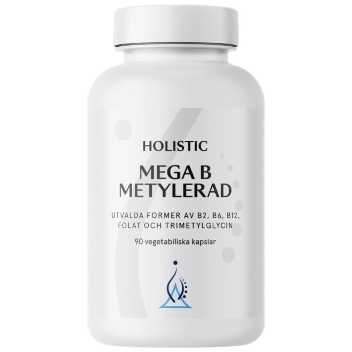 Holistic Mega B metylerad är ett kosttillskott med utvalda former av vitamin B2, B6, B12, folat och tri-metylglycin. Holistics källa till vitamin B12 är metylkobalamin, och källan till vitamin B6 är pyridoxal 5-phosphate (P5P), som är delaktig i ett stort antal enzymreaktioner i kroppen. Källan till folat är 5-metyltetrahydrofolat. Holistics ingrediens heter Quatrefolic®.