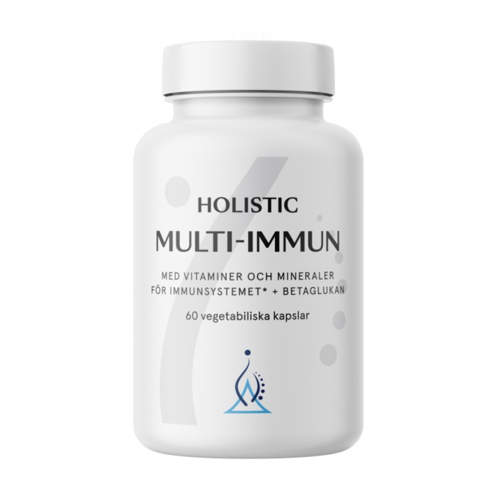 Holistic Multi-Immun innehåller vitamin C, D och B6 samt mineraler som zink, koppar och selen. Vitamin C, D och B6 samt zink, koppar och selen bidrar till immunsystemets normala funktion. Vitamin C och vitamin B6 bidrar till att minska trötthet och utmattning. Wellmune® är ett patenterat betaglukan, som är kliniskt testat.