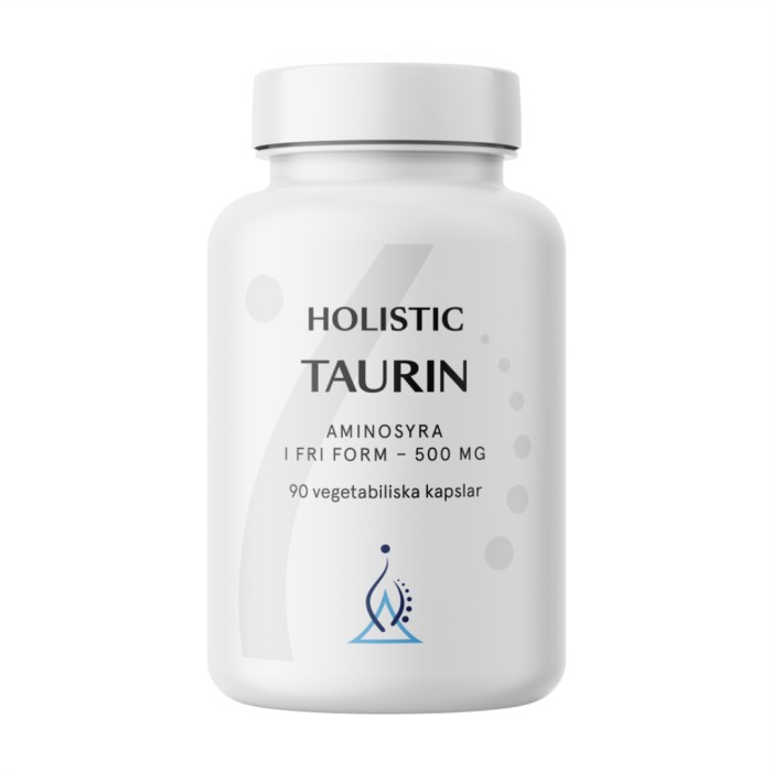 Holistic Taurin är ett kosttillskott som innehåller 500 mg taurin i fri form, vilket innebär att den inte är bunden till andra aminosyror eller utgör en del av ett protein, vilket underlättar dess upptag i kroppen. Taurin är en svavelhaltig aminosyra som finns naturligt i kroppen. Taurin finns i livsmedel från djurriket inklusive fisk och skaldjur, men är inte vanligt förekommande i vegetabiliska livsmedel. Vegansk.