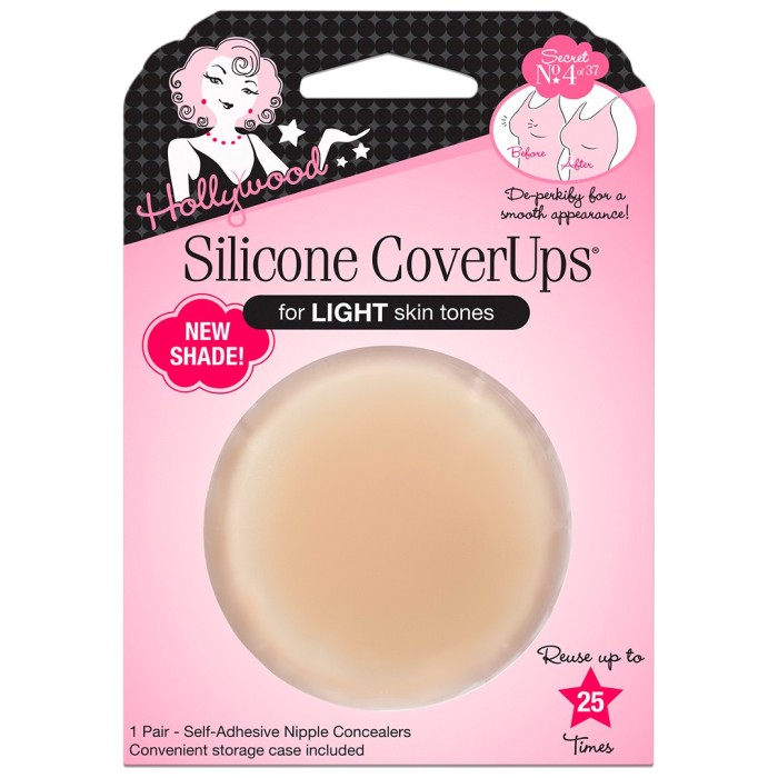 Silicone Cover Ups Light från Hollywood Fashion Secrets är ett par bekväma och självhäftande nipple covers i mjukt silikon som gör att bröstvårtorna inte syns igenom tunna, skira tyger. Bröstvårtsskydden är tillverkade i hypoallergent silikon och har tunna kanter som bidrar till att de känns komfortabla och får en jämn yta.