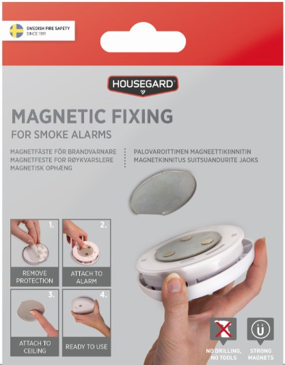 Innehåller två magneter med självhäftande tejp som fästes i taket och på brandvarnaren.