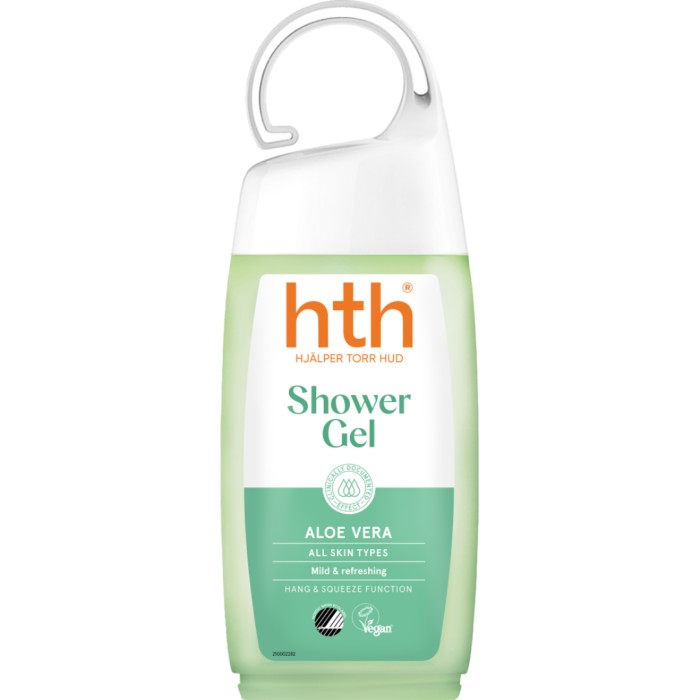 HTH Aloe Vera Shower Gel är en mild och härligt skummande duschtvål som rengör huden utan att vara uttorkande. HTH Aloe Vera duschgel innehåller fuktighetsbevarande och vårdande aloe vera. Flaska med praktisk ögla som du kan hänga upp i duschen.