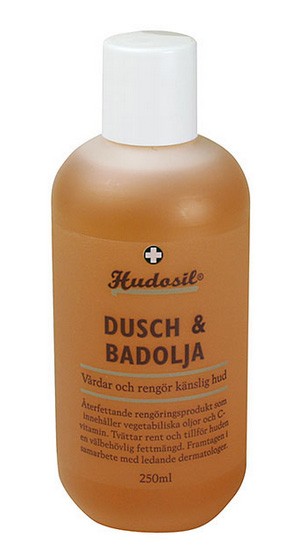 Hudosil Dusch & badolja består till 45 % av renade vegetabiliska oljor och är idealisk för dig som duschar ofta eller har torr hud. Utmärkt som olja i badvatten, ger då ett behagligt skum.