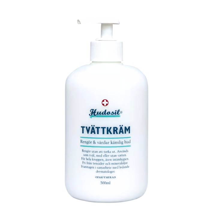 Hudosil Tvättkräm rekommenderas till torra hudpartier som händer och ansikte, och till intimhygien. Kan även användas till blöjbarn. Oparfymerad.