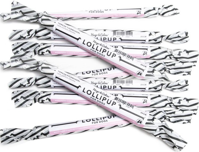 Hugo & Celine Lollipup är en tuggstång för din hund att tugga och gnaga på. Lollipup är tillverkad av 100 % tjurmuskel och innehåller endast svenska råvaror. Lollipup är ca 20 cm lång och väger ca 40 g.