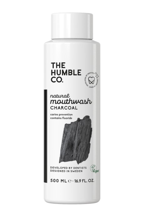 Humble Natural Mouthwash Charcoal är en munskölj med fluor för daglig användning. Detta munskölj innehåller även kol och har en smak av mint. Innehåller fluor 0,05%.