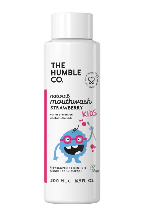Humble Natural Mouthwash Kids Strawberry är en munskölj med fluor för barn. Kan användas dagligen. Innehåller fluor 0,05%.