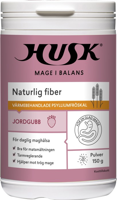 HUSK Mage i Balans Jordgubb är ett kosttillskott med en kombination av psylliumfröskal och jordgubbsflingor. HUSK Jordgubb har en krispig konsistens och en somrig bärsmak, och kan strös på yoghurt och andra kalla rätter. Psylliumfröskal absorberar vätska, sväller och bildar en gel. Psylliumfröskal innehåller 85 % kostfiber och är skonsamma mot magen.