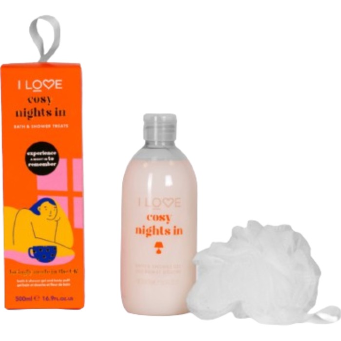 I LOVE Bathtime Treat - Cosy Nights In är ett kit med en duschtvål 500 ml och en "Body Puff". Cosy Nights In är en bad- och duschgel med en varm och inbjudande doft av varm choklad och marshmallows. I förpackningen medföljer en exfolierande "body puff" som du kan använda när du duschar för att göra huden ren, mjuk och smidig.