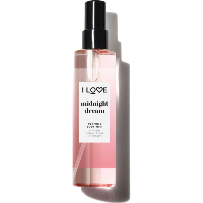 I LOVE:s serie med parfymerade Body Mist-dofter finns Midnight Dream, med toner av rosa peppar och apelsinblomma, ett hjärta av jasmin, kaffe och lakrits och en sensuell bas av vanilj, sandelträ och vit mysk.