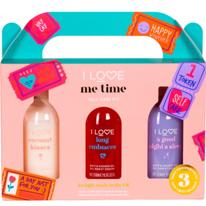 I Love Me Time är ett kit som kanske passar när du vill unna dig själv en spa-dag hemma. Löddra in dig med tvålen med söt doft av körsbär, eller njut av badtvålen med avslappnande doft av lavendel. Återfukta sedan huden med den krämiga doften av I LOVE kokosnöts-kroppssufflé.