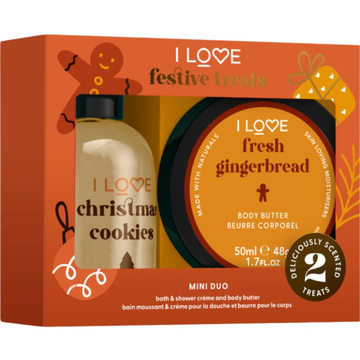 I LOVE® Miniature Treat Box Festive Treats är ett kit med en duschgel (100 ml) och ett body butter (50 ml). De härligt doftande bad- och kroppsprodukterna i detta kit från I LOVE har energigivande dofter av naturliga fruktextrakt. Duschgelen rengör huden och den vårdande hudkrämen gör huden mjuk och väldoftande.
