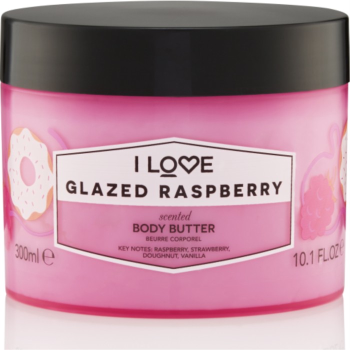I LOVE Signature Indulgent Glazed Raspberry Body Butter är ett rikt och krämigt bodybutter som ger huden fukt hela dagen. Det doftande kroppssmöret innehåller regenererande och närande sheasmör och ekologisk kokosnötsolja som ger fukt till huden. Krämen går snabbt in i huden och innehåller Provitamin B5, vitamin E, naturliga fruktextrakt och aloe vera-extrakt för att göra huden mjuk och len. Glazed Raspberry har en doft med inslag av hallonmunkar, jordgubb och vanilj.