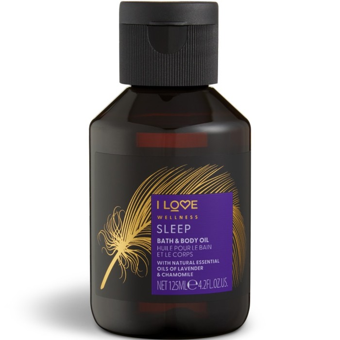I LOVE Wellness Bath & Body Oil Sleep är en bad- och kroppsolja med 99% naturliga ingredienser. Oljan återfuktar huden och ger den näring, och kan användas både i badet eller direkt på kroppen. Oljan har en rogivande doft av eteriska oljor från lavender och kamomill.