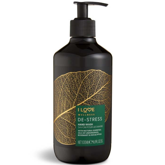 I LOVE Wellness Hand Wash Destress är en handtvål med 99% ingredienser av naturligt ursprung. Handtvålen rengör händerna effektivt utan att torka ut huden. Tvålen har en doft av eteriska oljor från citrongräs, rosmarin och eukalyptus. Dessutom innehåller tvålen petitgrainolja som lugnar huden, aloe vera-extrakt som gör huden mjuk och återfuktad samt E-vitamin, en antioxidant som återfuktar huden.