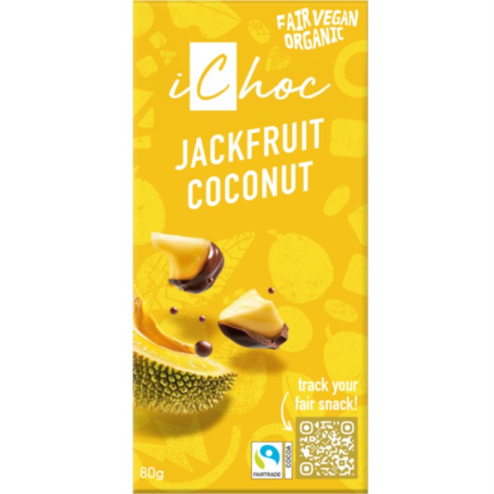 iChoc Jackfruit & Coconut är en mörk choklad med 62% kakaohalt som innehåller torkade bitar av jackfruit vilket ger chokladen en exotisk smak som påminner om mango, papaya och banan. Chokladkakan innehåller knapriga bitar av kokoschips och syrliga citroncrisp, för en väldigt speciell smakupplevelse. 100% ekologiska och veganska ingredienser. Tillverkad av Fairtrade-märkt kakao från Dominikanska republiken. Förpackad i en plastfri förpackning.