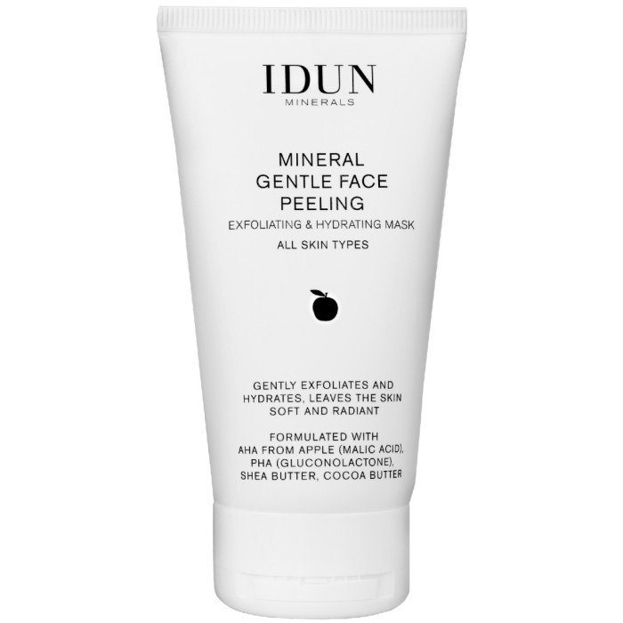 IDUN:s Gentle Face Peeling innehåller äppelsyra och glukonsyra som hjälper till att avlägsna döda hudceller och att göra huden mjuk. Peelingen är berikad med mineraler (magnesium, zink och kalium), fuktbindande PCA och oljor från raps, shea och kakaosmör som vårdar och mjukgör huden.