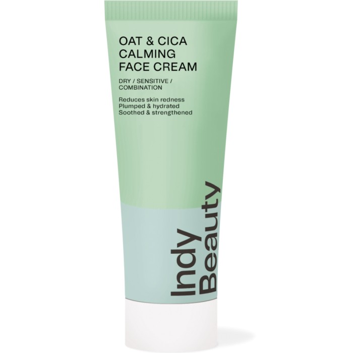 Indy Beauty Oat & Cica Calming Face Cream ör en lugnande ansiktskräm som hjälper till att neutralisera och motverka rodnad. Den djupt återfuktande krämen passar även för känslig och torr hud. Oat & Cica Calming Face Cream innehåller vårdande ingredienser som havre, allantoin och centella asiatica (Cica). Innehåller hudvårdande och återfuktande pantenol, squalane och glycerin, och en blandning av ceramider och hudidentiska lipider som bidrar till att stärka hudens barriär. Två olika hyaluronsyror plumpar och minskar synligheten av fina linjer.