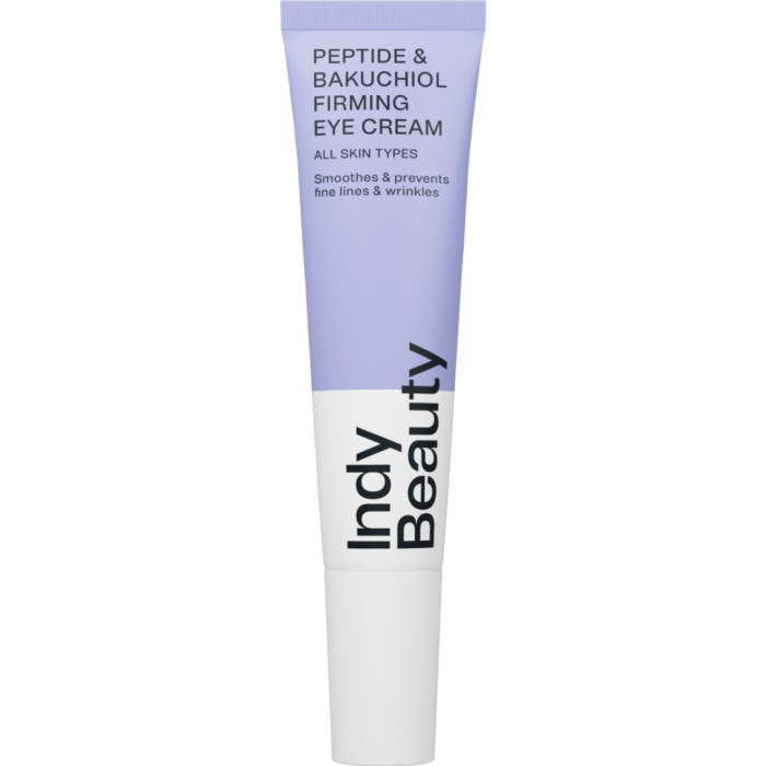 Peptide & Bakuchiol Firming Eye Cream från Indy Beauty är en re-vitaliserande ögonkräm för mogen hud. Krämen innehåller 1% Bakuchiol (ofta kallad naturens egen retinol) och 2% Argireline® peptide, ett peptidkomplex. Tillsammans arbetar dessa ingredienser på att förebygga och minska fina linjer och rynkor genom att bland annat stimulera kollagenproduktionen. Indy Beautys Peptide & Bakuchiol ögonkräm innehåller även pantenol och allantoin som lugnar och återfuktar huden, medan vitamin E agerar som en skyddande antioxidant för den känsliga huden under ögonen.