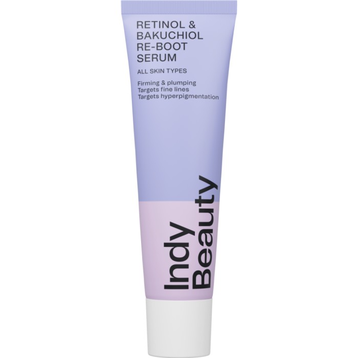 Indy Beauty Retinol Re-Boot Serum är ett re-vitaliserande nattserum för mogen hud. Serumet innehåller en kombination av 0,05% retinol och 0,5% bakuchiol som tillsammans förstärker varandras effekt för att förbättra hudens struktur och minska synligheten av fina linjer.