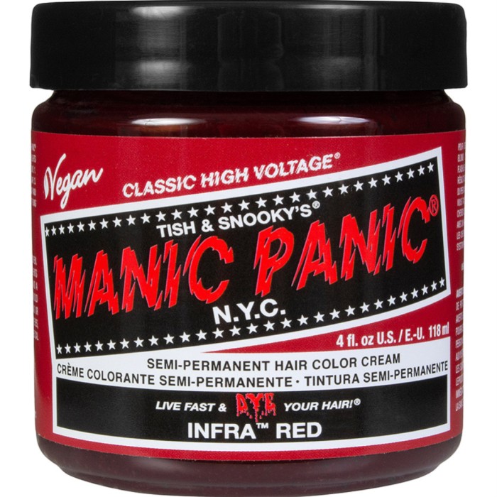 Semipermanent hårfärg från Manic Panic i färgen Infra Red. Infra Red är en djupt mahognyröd färg med varma toner. Den här hårfärgen kan ge varma, röda toner även till obehandlat, oblekt hår, men ger bäst resultat i ett ljusblont hår. Mörkare nyanser kan ge fantastiska ljusa slingor i mörkare hår.
