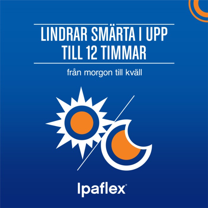 Ipaflex är ett receptfritt läkemedel som används vid kortvarig, symtomatisk behandling av lätt till måttlig smärta. Ipaflex innehåller det aktiva ämnet naproxennatrium. Det tillhör en grupp läkemedel som kallas ”icke steroida antiinflammatoriska läkemedel” eller NSAID-läkemedel.