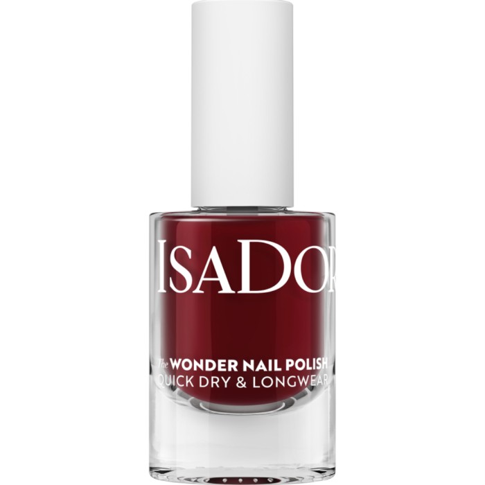 IsaDora The Wonder Nail är varumärkets ikoniska, snabbtorkande och långvariga nagellack som finns i ett stort urval nyanser. I IsaDoras sortiment finns allt från svala, stiliga och naturliga nyanser till härliga mjuka pastellfärger, starka ljusa färger samt intensiva mörka toner. Den speciella, extra breda penseln är innovativt framtagen för att ge en fyllig och jämn finish utan ränder. Den högpresterande formuleringen är snabbtorkande, flagnar inte och är utformad för att behålla färgen under hela användningen.