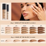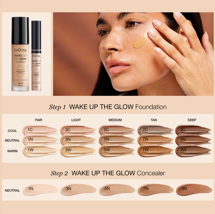 Wake Up the Glow Foundation finns i ett utbud av nyanser utvecklat för att passa ett spektrum av varma, neutrala samt kalla undertoner och för att matcha serien Wake Up the Glow Concealer.