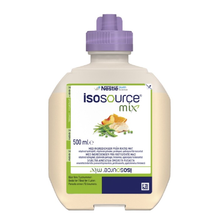 Komplett sondnäring för patienter med normalt energi- och näringsbehov. Innehåller riktiga råvaror för att efterlikna vanlig mat i så stor utsträckning som möjligt. Sondnäring baserad på vanlig mat kan minska toleransproblem samtidigt som det kan ge patienten känslan av att ha en äkta matupplevelse. Innehåller fiber både naturligt förekommande från frukt och grönsaker samt tillsatta lösliga och olösliga fiber. Lämplig för vuxna och barn från 3 år. Används på inrådan av läkare eller dietist. Isosource Mix kan användas som enda näringskälla vid dosering ≥1500 ml/dag.