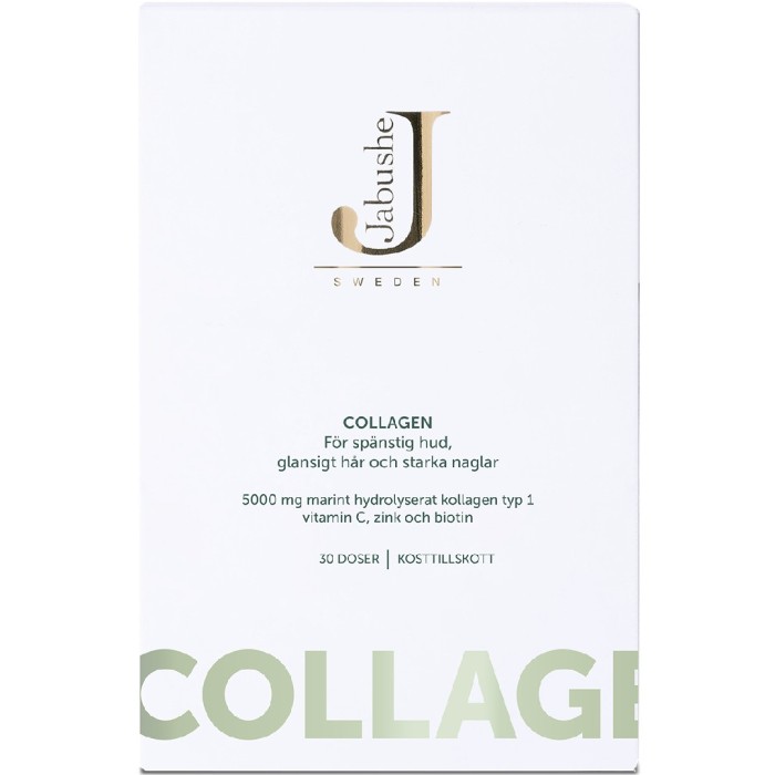 Jabushe Collagen är ett kosttillskott för hud, hår och naglar. Jabushe Collagen har en specialkomponerad formulering med kollagen, vitaminer och mineraler för att vara ett komplett näringstillskott för hud, hår och naglar och ett komplement till den dagliga hudvårdsrutinen. Jabushe Collagen innehåller 5000 mg lågmolekylärt marint kollagen per dagsdos, och innehåller den rekommenderade dagsdosen av C-vitamin.