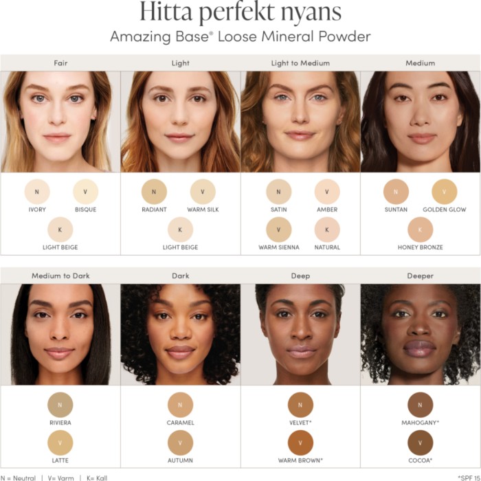 Amazing Base ger SPF20, utom nyanserna Cocoa, Mahogany, Velvet och Warm Brown som ger SPF15.