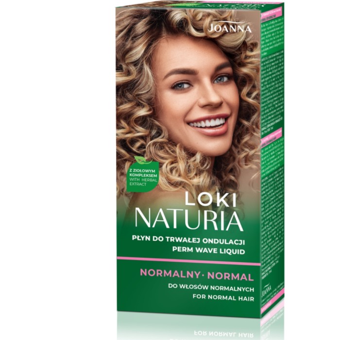 Joanna Loki Naturia Normal permanent med örtextrakt, för normalt hår. Formuleringen innehåller bland annat extrakt från björk och brännässla för att vårda håret, och hydrolyserade keratinproteiner som regenererar, vårdar och återfuktar intensivt.