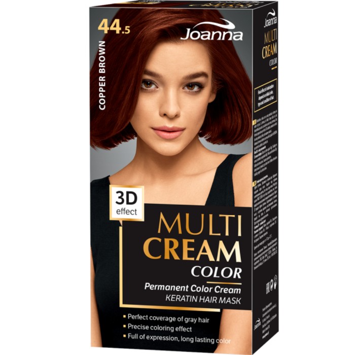 Joanna Multi Cream Color är en permanent hårfärg som täcker grått hår. 3D-effekt som ger ett intryck av djup. Ger naturlig volym och en vacker och fyllig färg. Med UV-filter som förhindrar färgblekning av solen. PPD-fri (dvs innehåller ej Para-phenylenediamin). En keratin-hårmask medföljer i förpackningen.