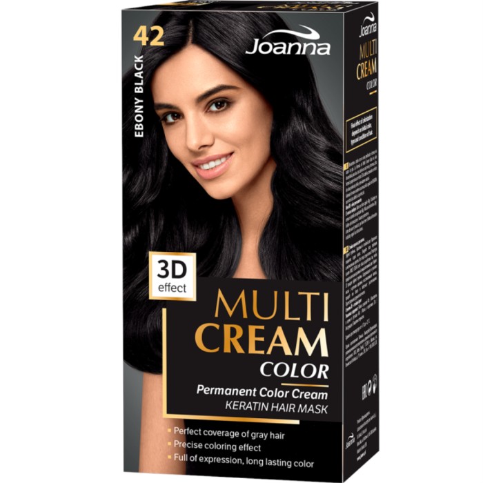 Joanna Multi Cream Color är en permanent hårfärg som täcker grått hår. 3D-effekt som ger ett intryck av djup. Ger naturlig volym och en vacker och fyllig färg. Med UV-filter som förhindrar färgblekning av solen. PPD-fri (dvs innehåller ej Para-phenylenediamin). En keratin-hårmask medföljer i förpackningen.