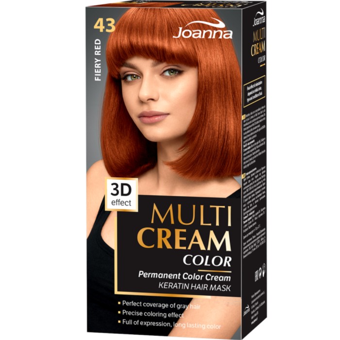 Joanna Multi Cream Color är en permanent hårfärg som täcker grått hår. 3D-effekt som ger ett intryck av djup. Ger naturlig volym och en vacker och fyllig färg. Med UV-filter som förhindrar färgblekning av solen. PPD-fri (dvs innehåller ej Para-phenylenediamin). En keratin-hårmask medföljer i förpackningen.