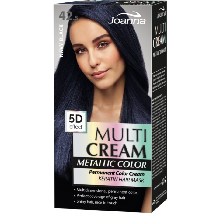 Joanna Multi Cream Color Metallic är hårfärger i kalla moderiktiga färger med metalliska reflexer. Permanent hårfärg med 5D-effekt med djup och väldigt intensiva färger. Ger mycket glans och färg och har en volymeffekt. En hårmask med keratin ingår i förpackningen.
