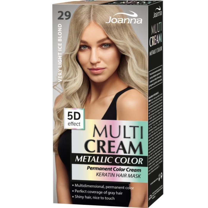 Joanna Multi Cream Color Metallic är hårfärger i kalla moderiktiga färger med metalliska reflexer. Permanent hårfärg med 5D-effekt med djup och väldigt intensiva färger. Ger mycket glans och färg och har en volymeffekt. En hårmask med keratin ingår i förpackningen.
