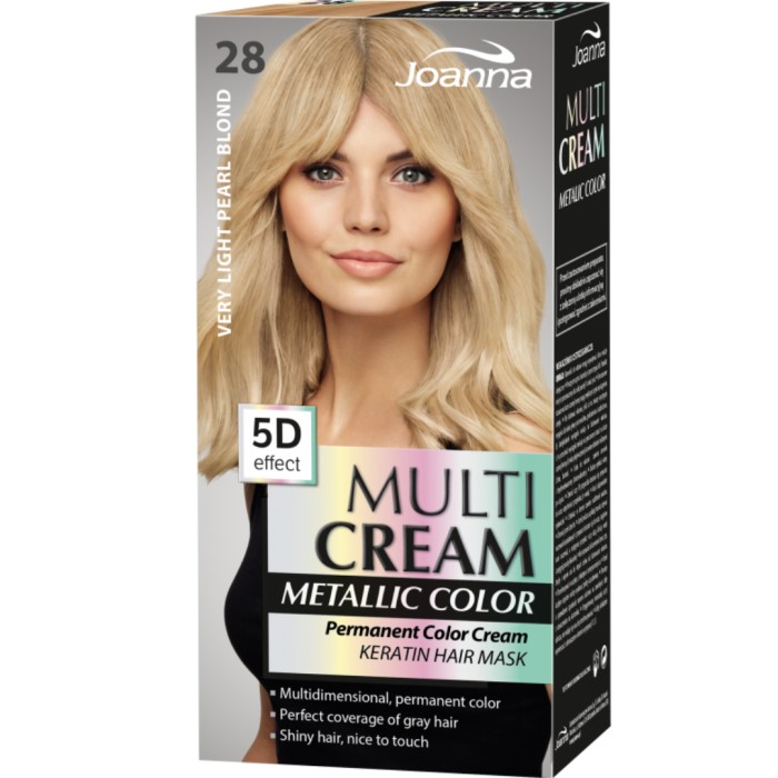 Joanna Multi Cream Color Metallic är hårfärger i kalla moderiktiga färger med metalliska reflexer. Permanent hårfärg med 5D-effekt med djup och väldigt intensiva färger. Ger mycket glans och färg och har en volymeffekt. En hårmask med keratin ingår i förpackningen.